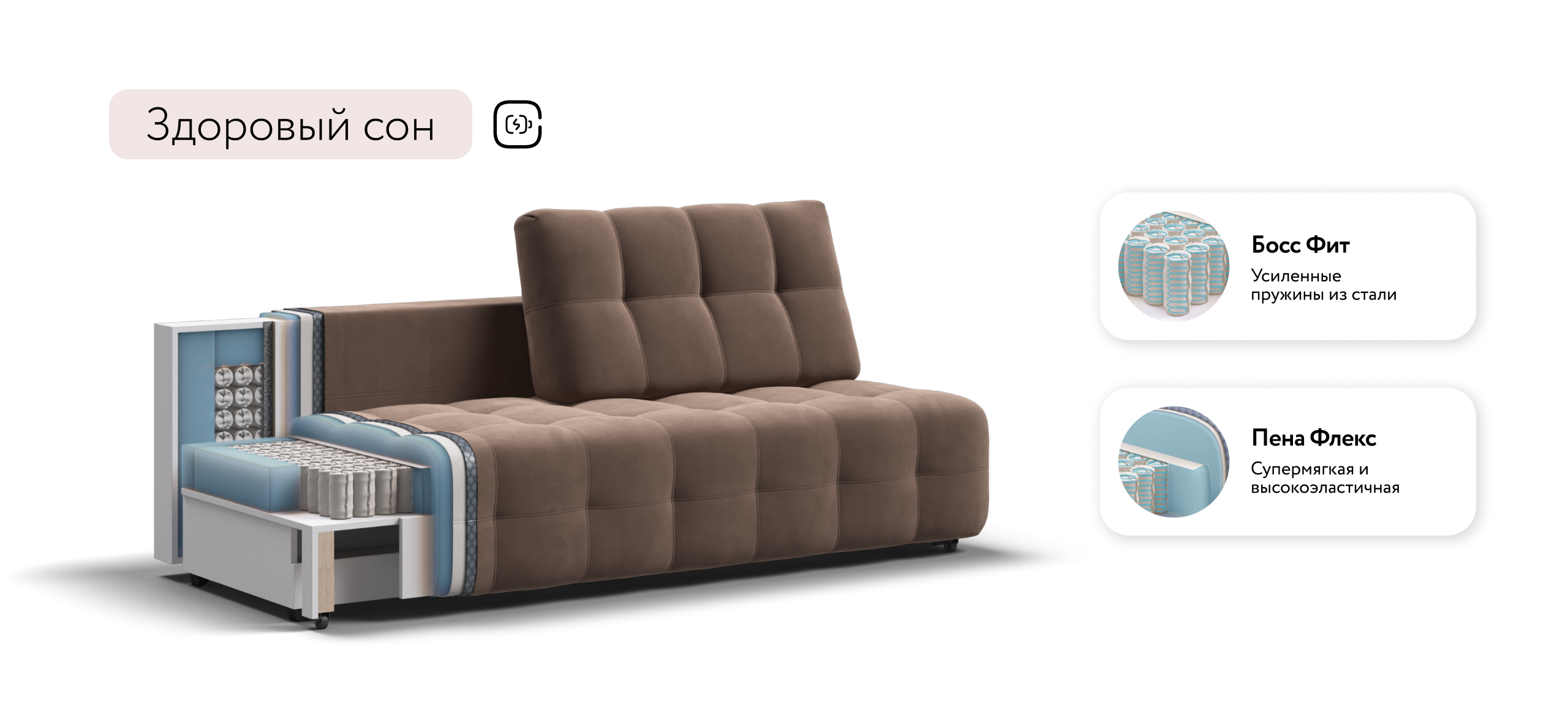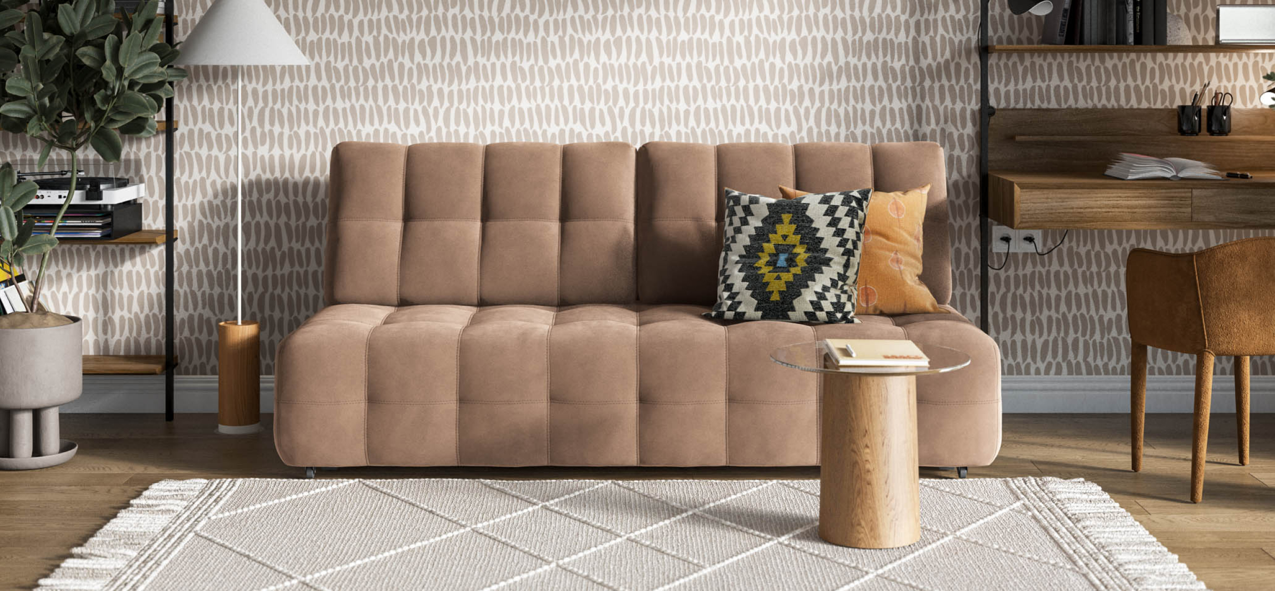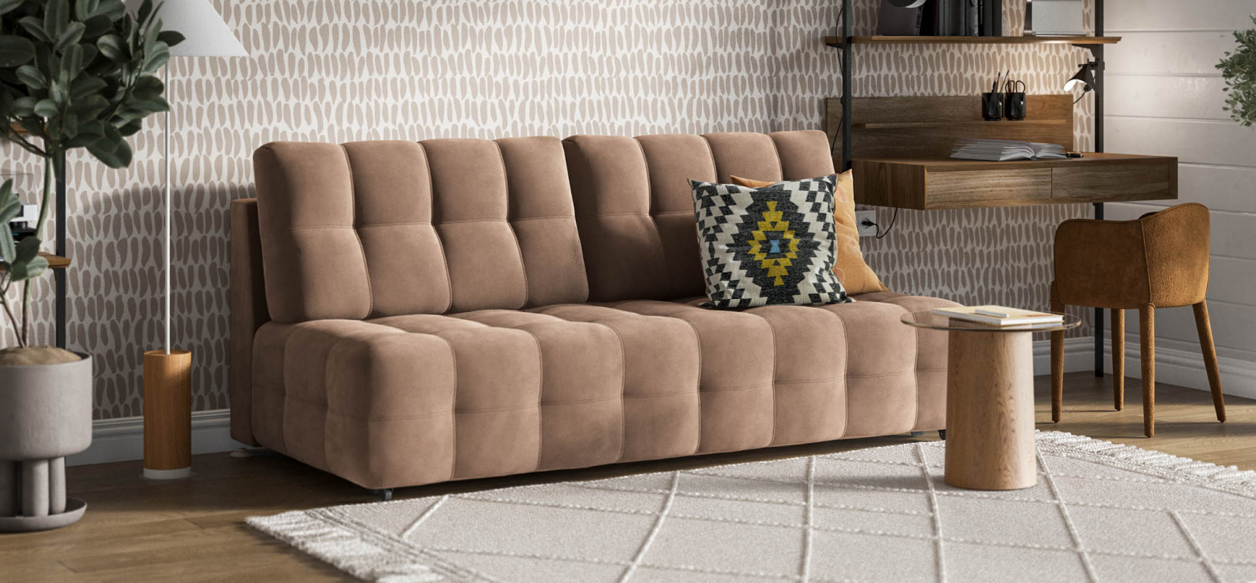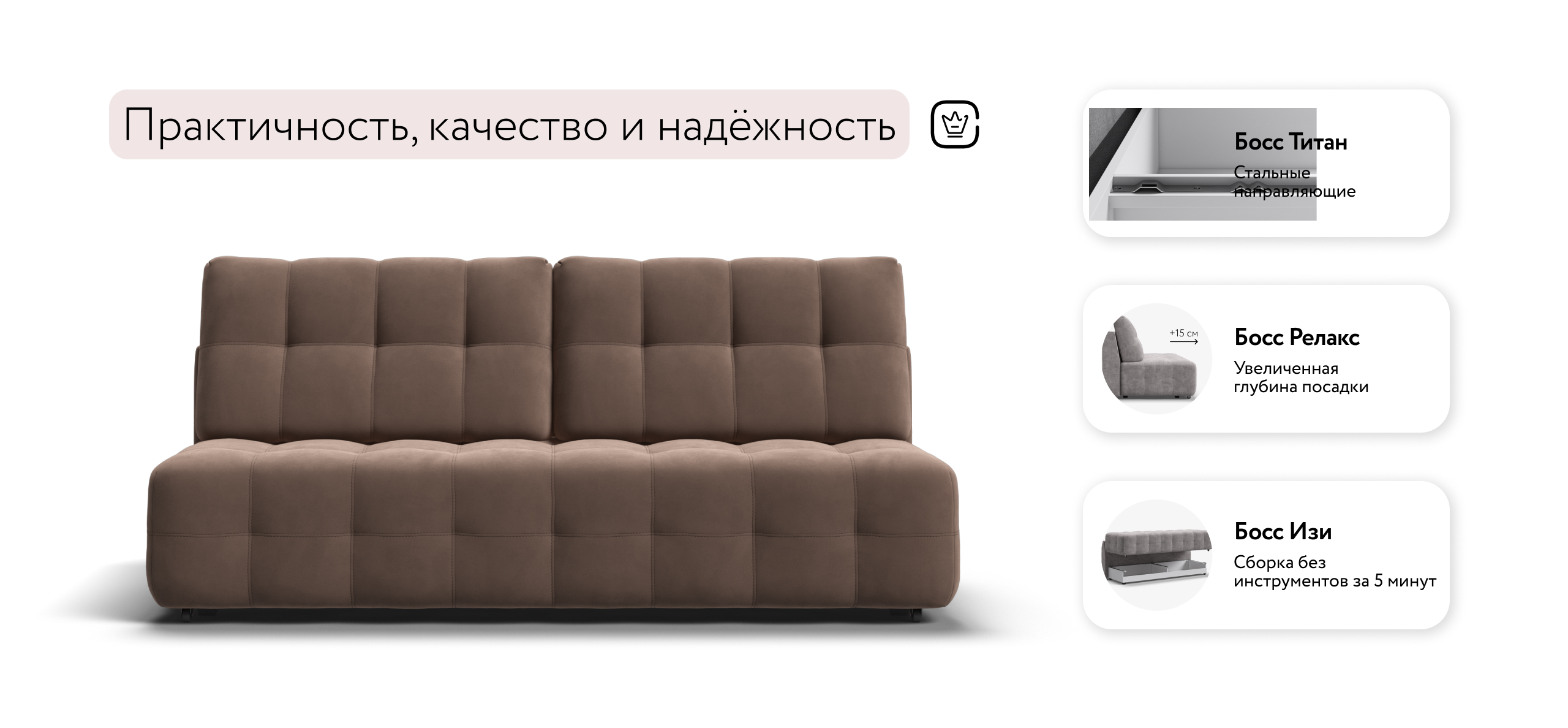 Диван СОтА-75 мини — отсутствие подлокотников и минималистичный дизайн. Надежный механизм трансформации благодаря стальным направляющим BOSS TITAN. 2 режима раскладки: RELAX позволяет увеличить глубину сиденья на 30% для большего комфорта, а полная раскладка обеспечивает большое и ровное спальное место. Ощутите истинный комфорт у себя дома!