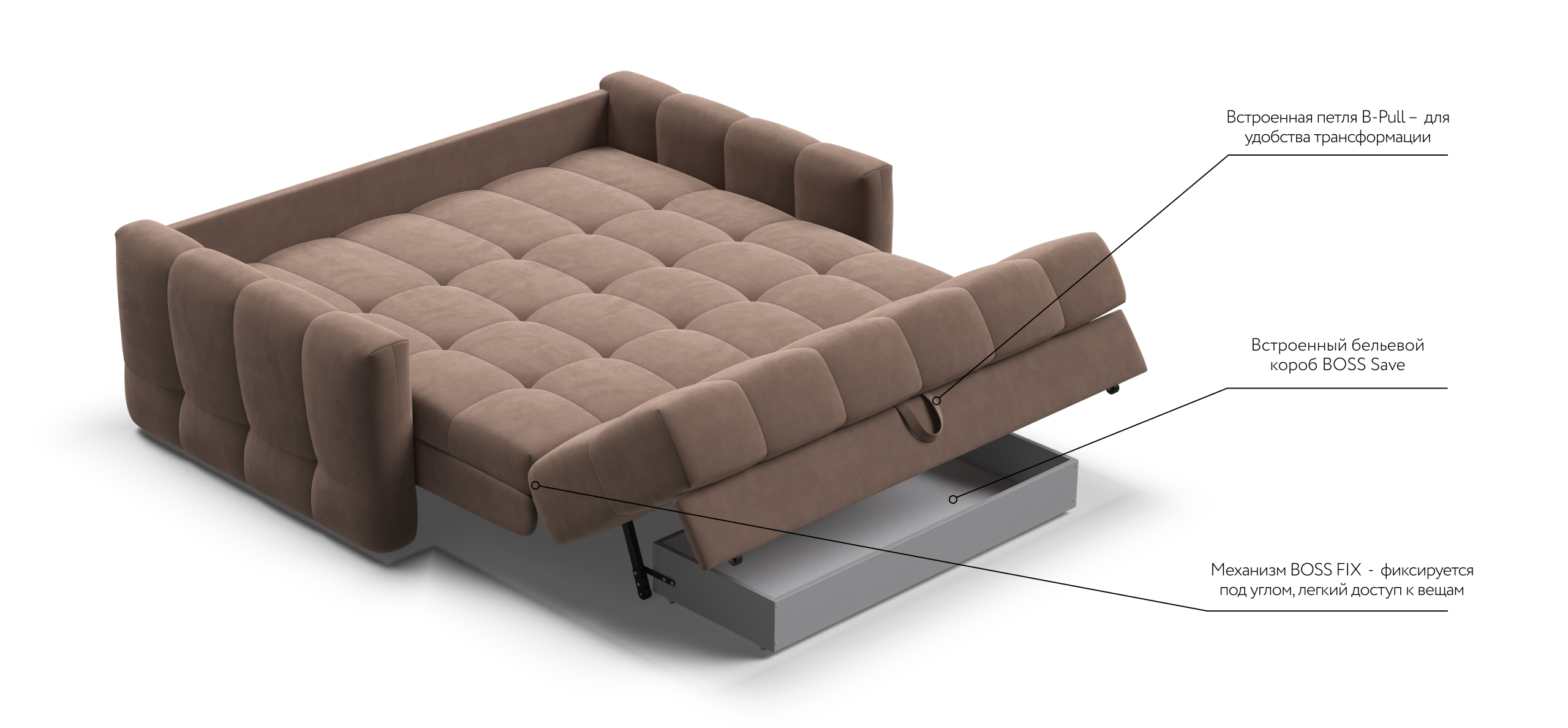 Благодаря прочному и надежному механизму аккордеон и встроенному матрасу, ночью Вы получаете большое, ровное спальное место, а днем, в сложенном состоянии, место для отдыха и экономию пространства.