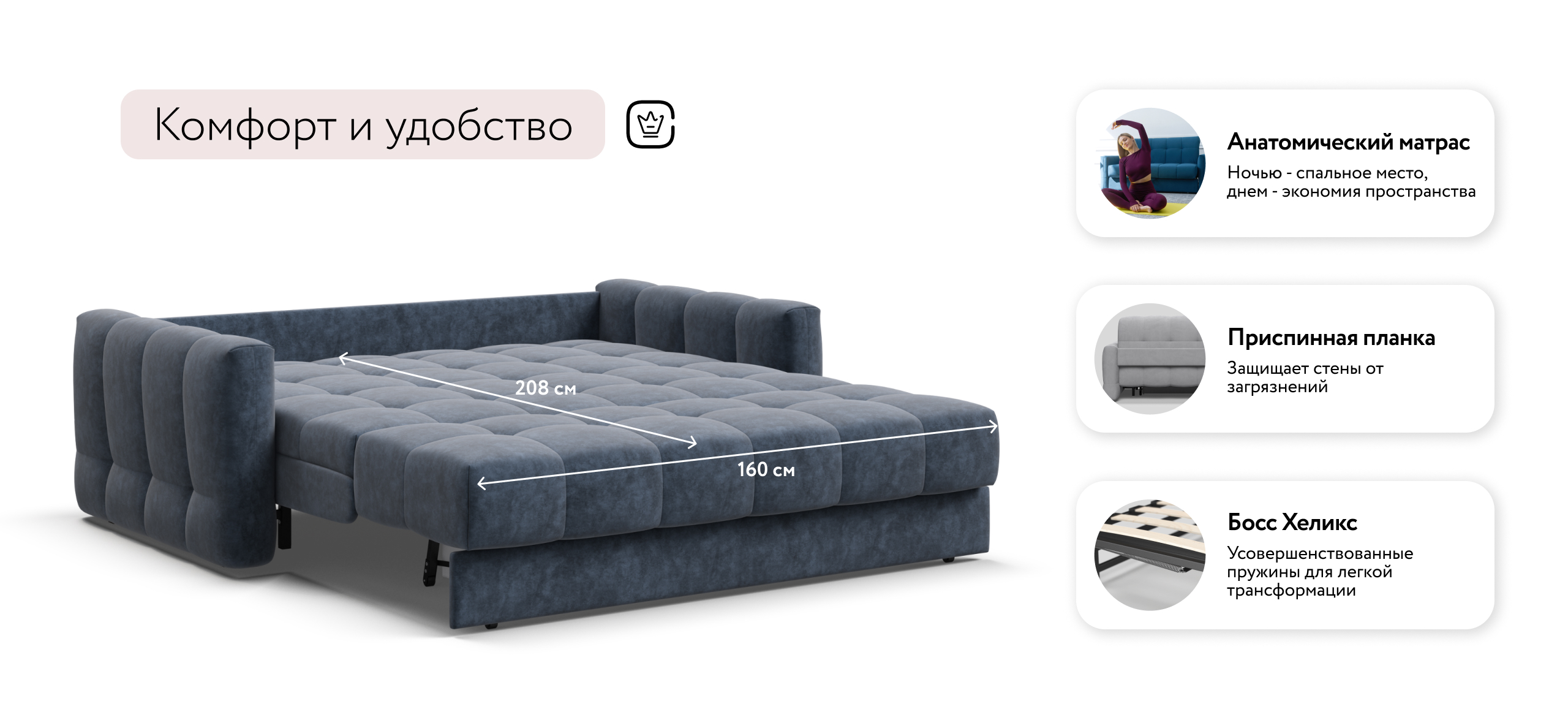 Инновационный анатомический матрас Quality в диване, высотой 15 см., выполнен из полноценного независимого пружинного блока FIT и высокоэластичной пены FLEX – гарантия здорового сна, как на кровати!