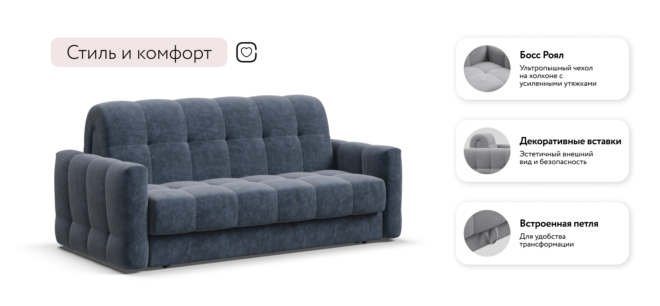 Чехол Royal с ультропышной стежкой на холконе и усиленными утяжками делает диван пышным и воздушным, а усиленные утяжки надежно фиксируют чехол и защищают его от растяжения.