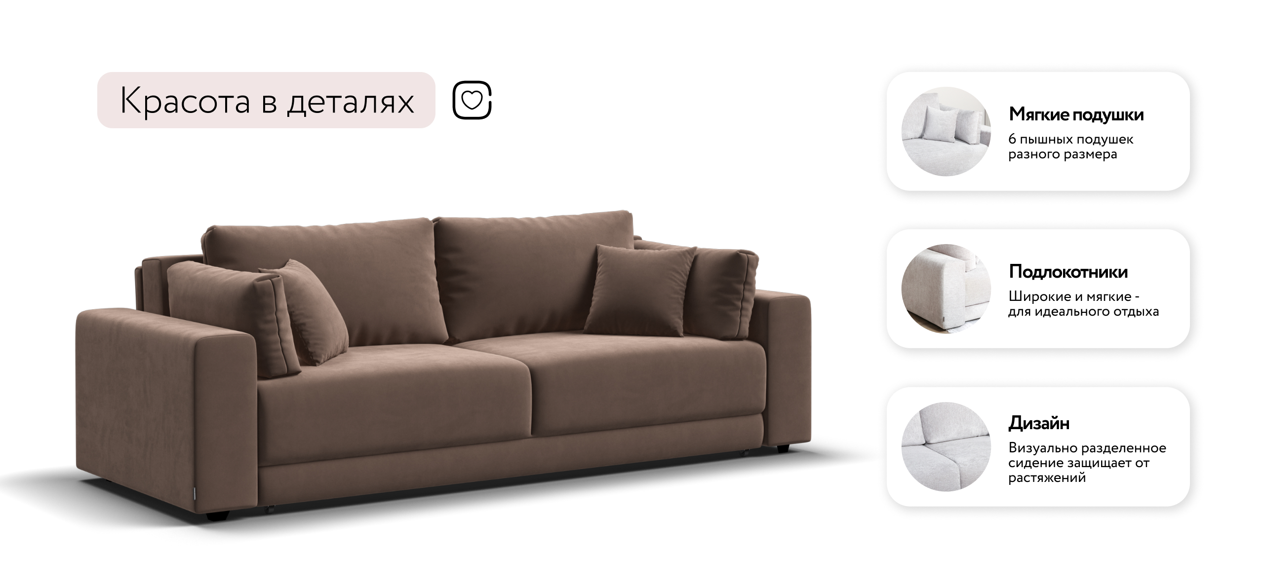 Диван СОтА-77 — это сочетание современного дизайна и продуманной эргономики, создающее уютную атмосферу в любом интерьере. Визуально разделённое сиденье, широкие мягкие подлокотники и пышные подушки разного размера обеспечивают не только эстетическую привлекательность, но и максимальный комфорт.