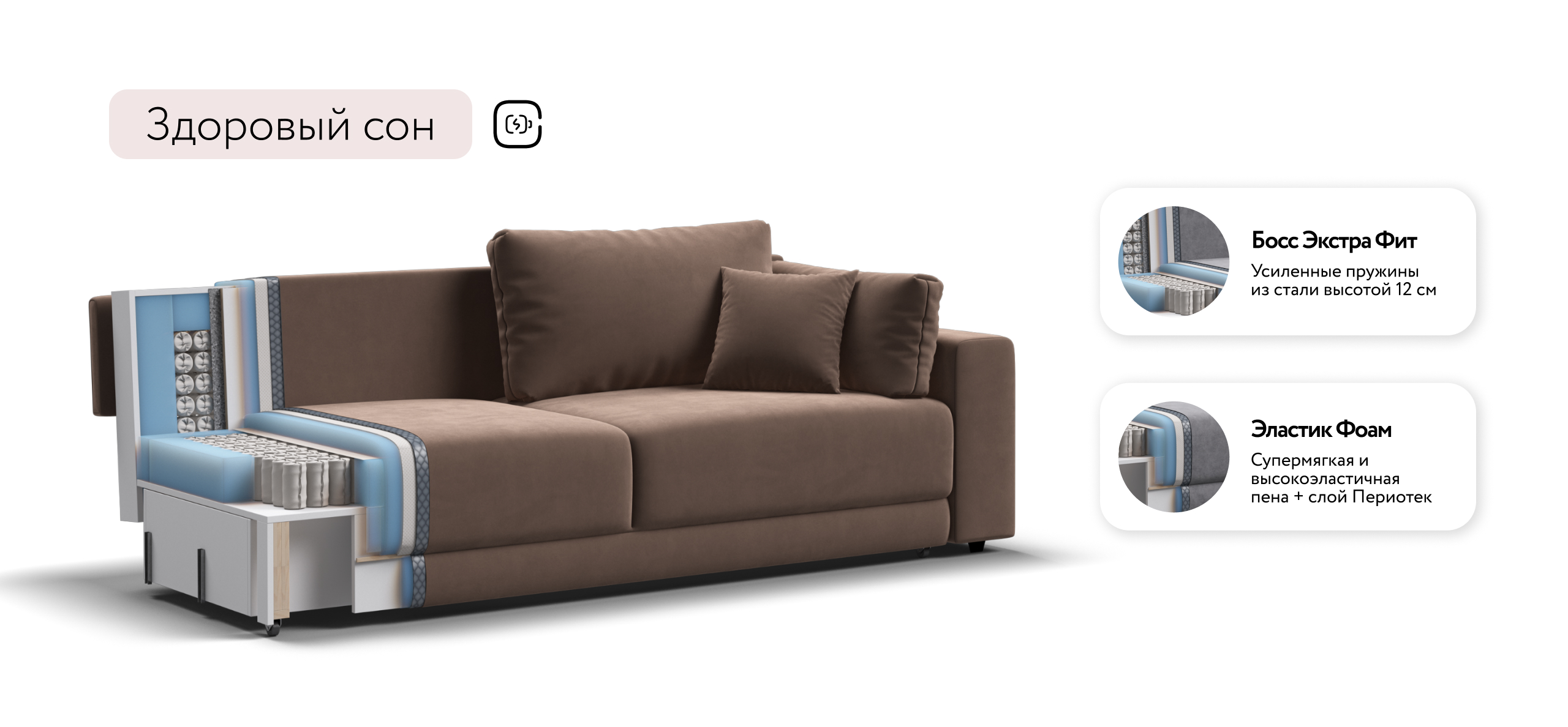 Оснащённый независимым пружинным блоком и высокоэластичной пеной Эластик Фоам с дополнительным слоем периотека, диван гарантирует анатомическую поддержку и комфортный сон. Простой и надёжный механизм трансформации «еврокнижка» позволяет легко преобразовать диван в просторное спальное место.