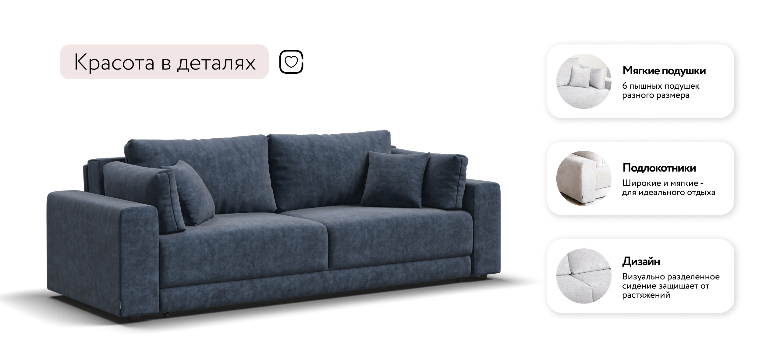 Диван СОтА-77 — это сочетание современного дизайна и продуманной эргономики, создающее уютную атмосферу в любом интерьере. Визуально разделённое сиденье, широкие мягкие подлокотники и пышные подушки разного размера обеспечивают не только эстетическую привлекательность, но и максимальный комфорт.