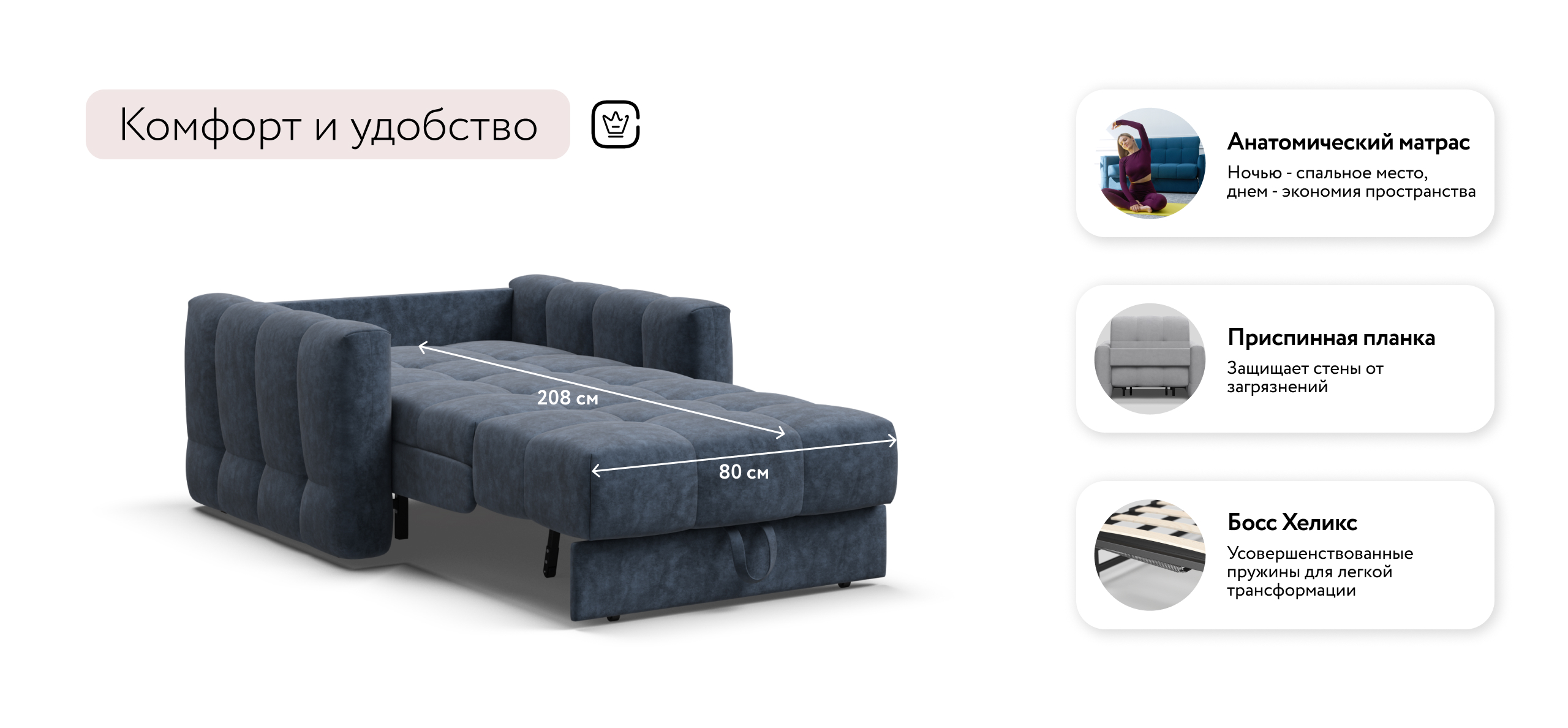 Благодаря прочному и надежному механизму аккордеон BOSS PRO, кресло-кровать прекрасно сочетает в себе две функции: комфортный отдых днем и полноценное дополнительное спальное место для гостя или ребенка ночью.