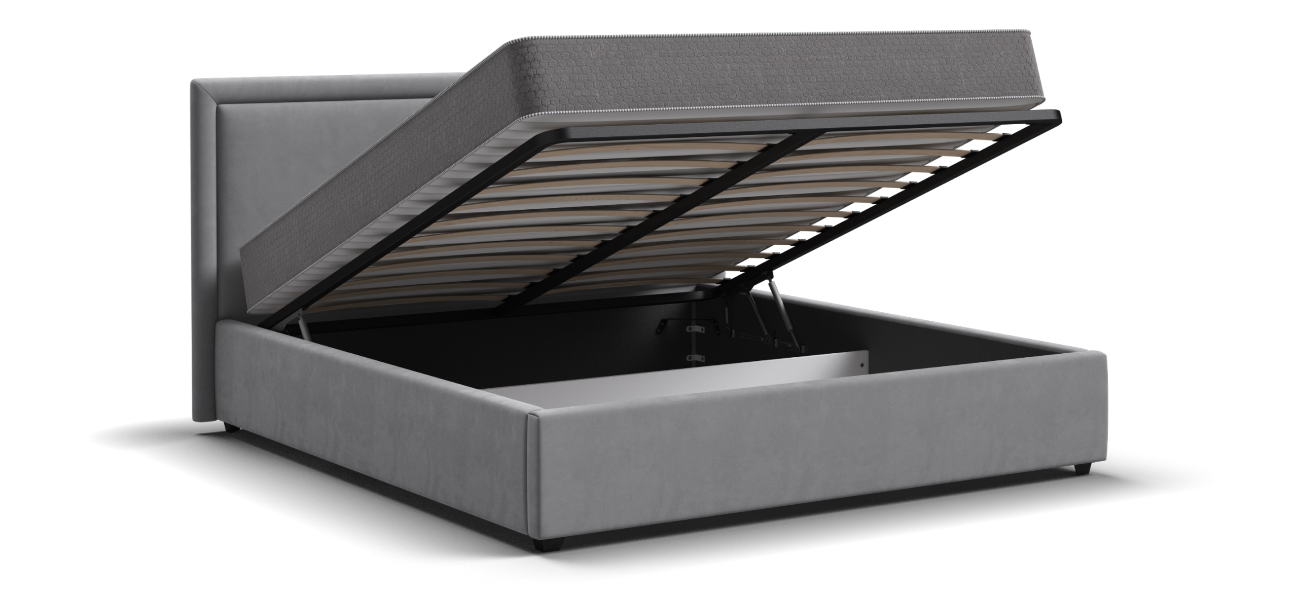 Под матрасом скрывается вместительное пространство для хранения, которое не выдает себя ни внешне, ни по звучанию — всё открывается легко и бесшумно. Это возможность освободить комнату от лишнего, сохранив только лёгкость и порядок вокруг.