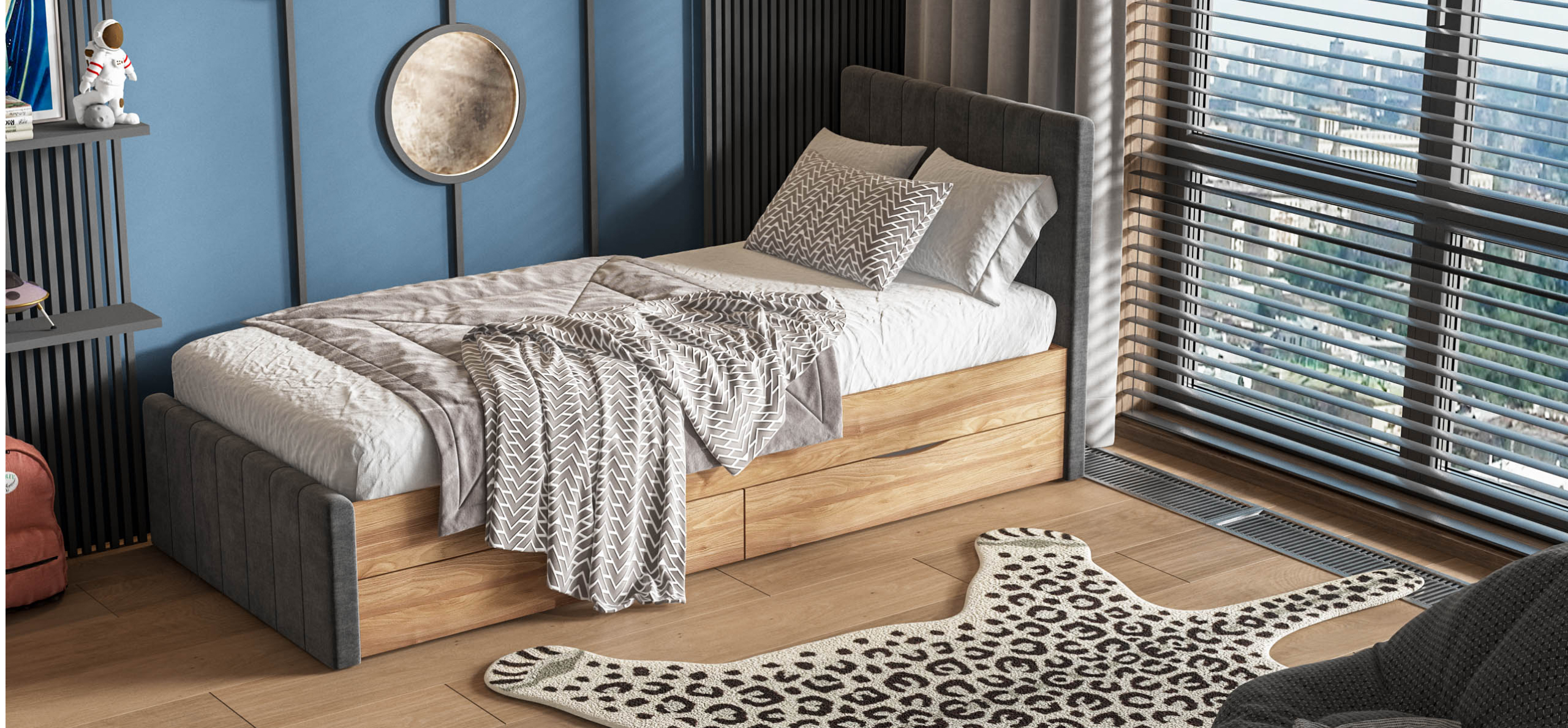 Благодаря сочетанию мягких и корпусных элементов кровать ЛОФТ Мини смотрится минималистично и сдержанно. Дизайн подходит к современному и классическому интерьеру. Каркас кровати изготовлен из ЛДСП европейского качества, экологического класса Е1. Обивка выполнена из высококачественных материалов, которые долговечны и просты в уходе. Для мягкости спинки и изножья используется современный, гипоаллергенный, износостойкий материал SOFTFOAM. Два выкатных ящика на колесиках-роликах с усиленным основанием ROLLBOX создают дополнительное место для хранения постельного белья, игрушек и полезных мелочей. В комплекте к кровати идёт усиленное анатомическое основание, состоящее из металлической разборной рамы и упругих берёзовых ламелей. Для создания качественного покрытия на поверхности изделия применяется технология порошковой покраски. Конструкция позволяет выдерживать большую динамическую нагрузку. Ящики универсальные и собираются на правую или левую сторону по желанию покупателя.
