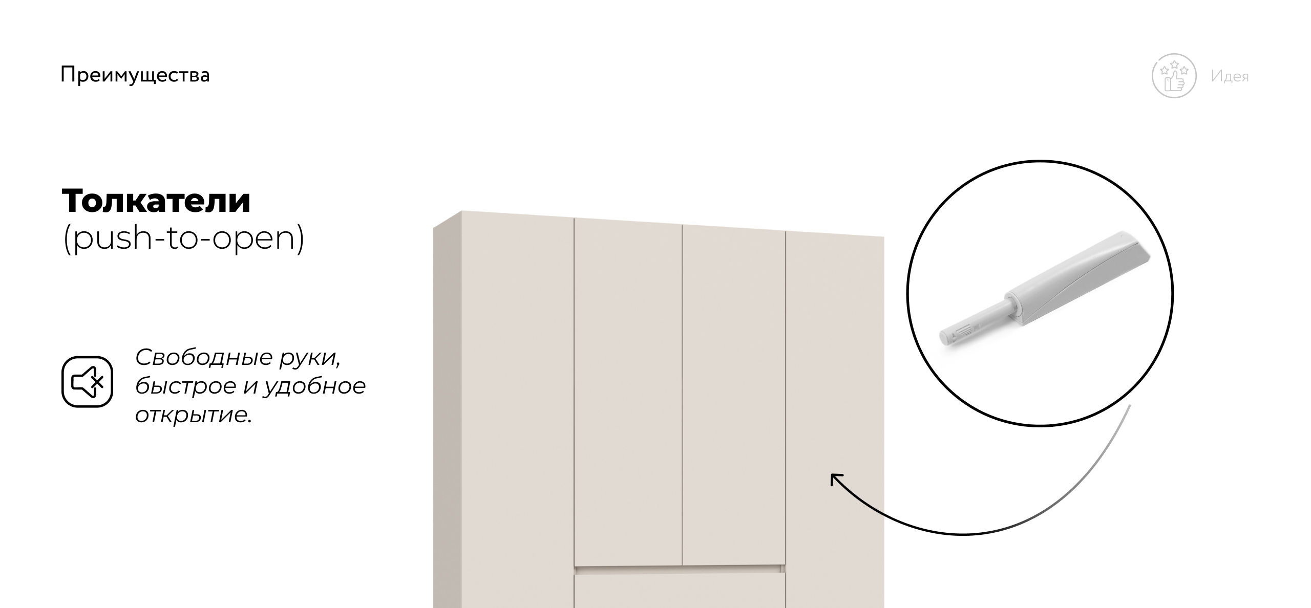 Два оттенка — тёплый Кашемир и светлый Белый — легко встраиваются в сценарии современной квартиры: от спокойного минимализма до мягкой неоклассики. Итог — ощущение упорядоченности и воздуха, когда всё на своём месте и всё под рукой.