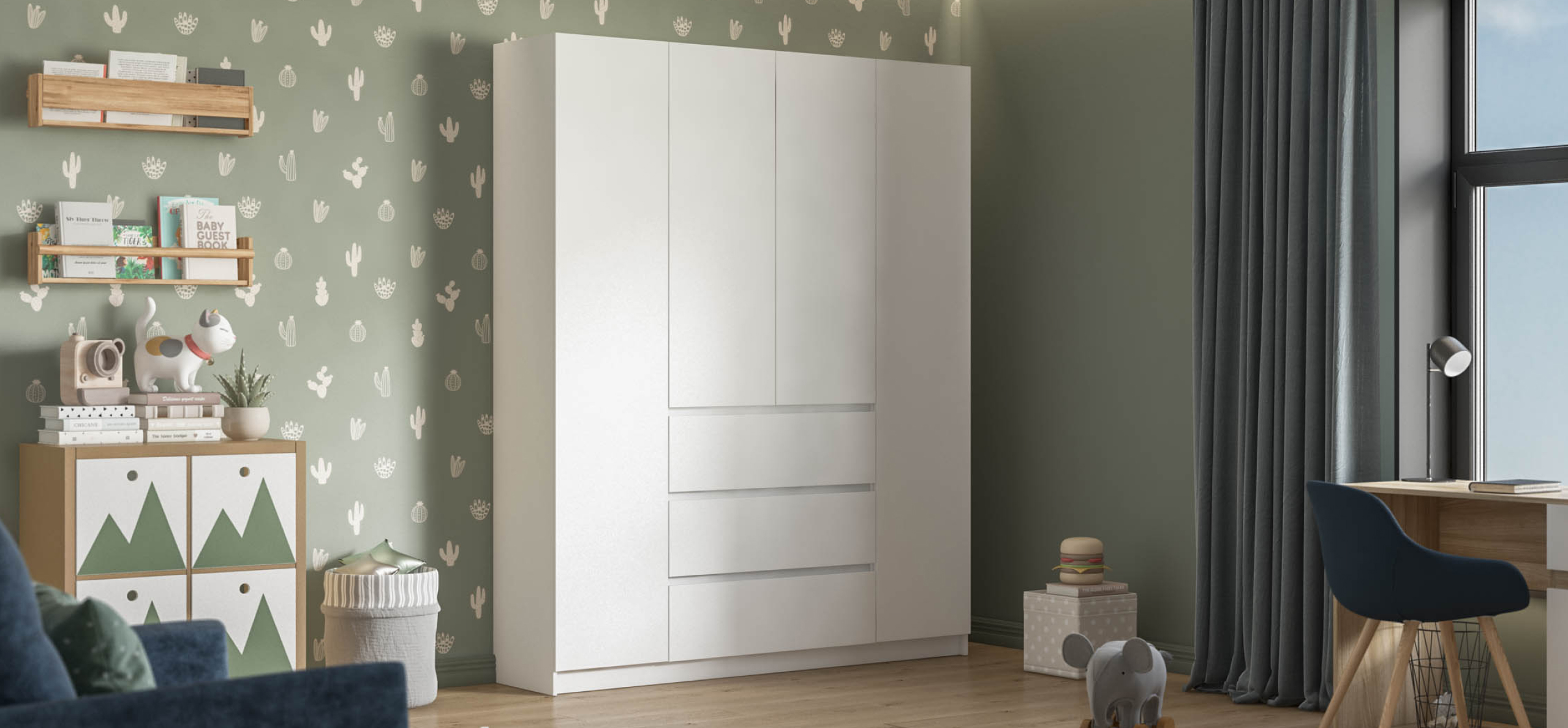 Шкаф становится чётко и ровно на любом покрытии: линии сходятся, зазоры аккуратные, двери ходят тихо и стабильно. Материалы — практичные и безопасные для дома (ЛДСП Е1), кромки аккуратно обработаны, чтобы внешний вид держался годами.