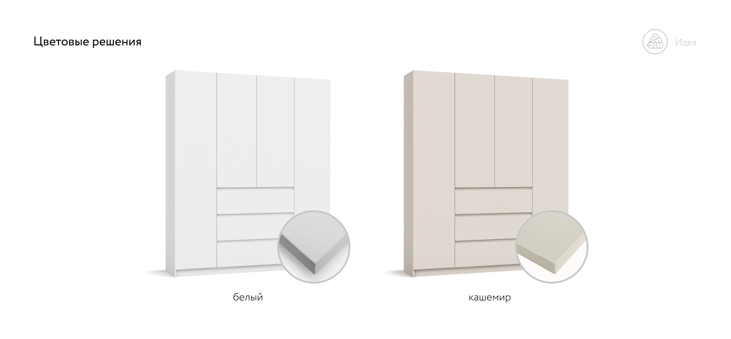 Два оттенка — тёплый Кашемир и светлый Белый — легко встраиваются в сценарии современной квартиры: от спокойного минимализма до мягкой неоклассики. Итог — ощущение упорядоченности и воздуха, когда всё на своём месте и всё под рукой.