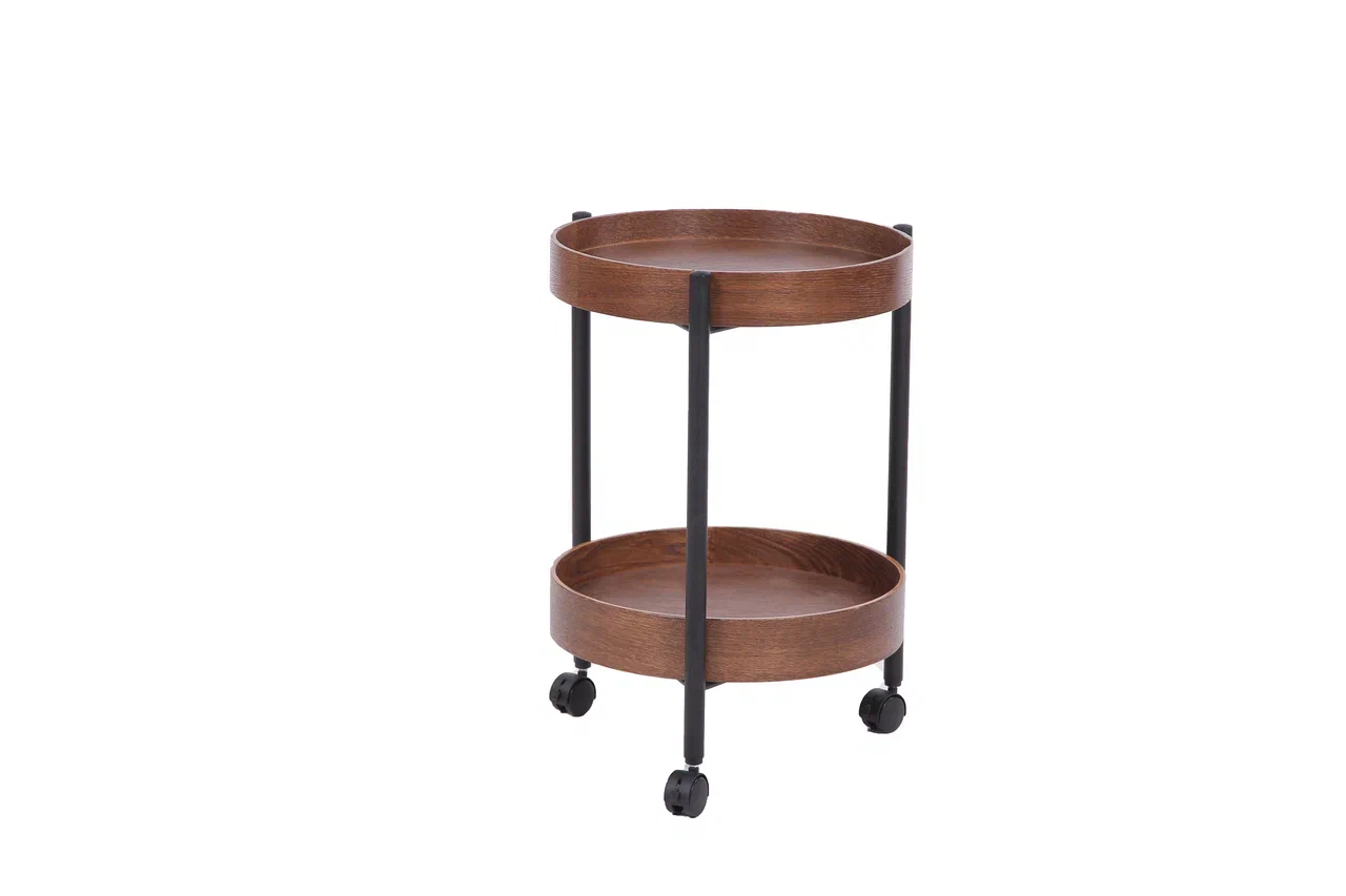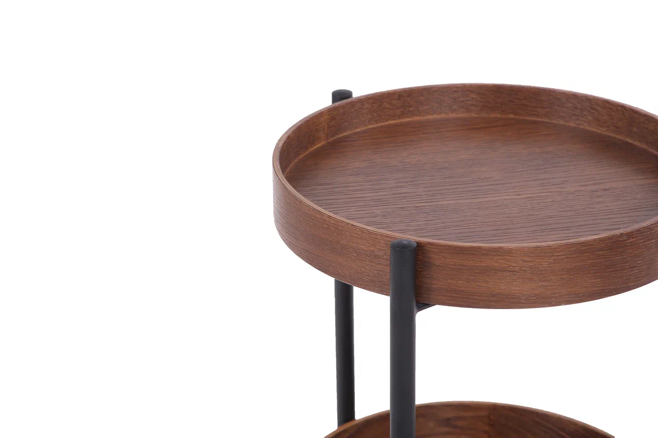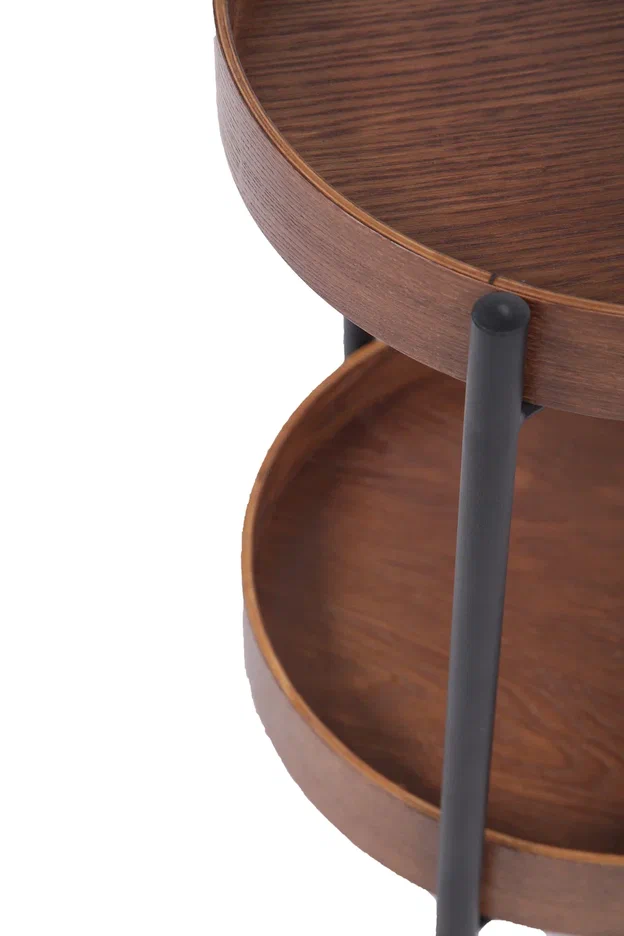 Особенность модели — две круглые съёмные столешницы, выполненные из натурального шпона дуба. Каждая столешница имеет бортики по краю, благодаря чему её можно использовать как отдельный поднос для сервировки — практично и функционально.
