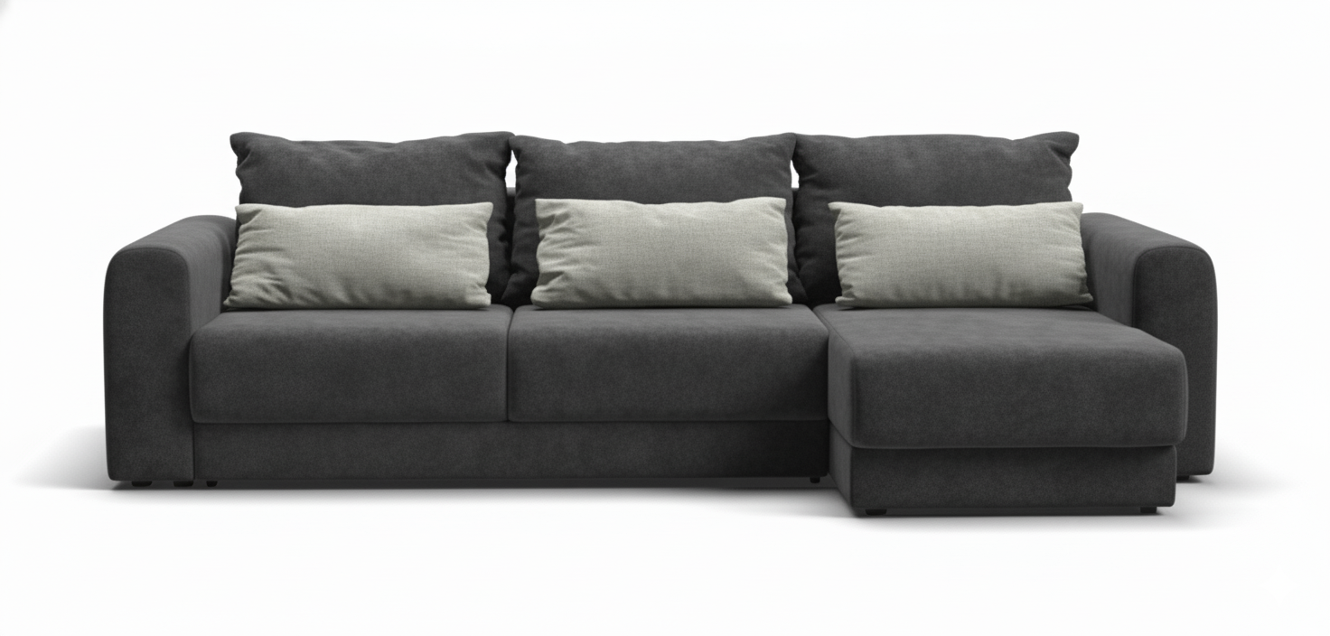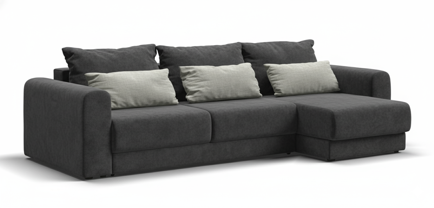 Диван СОтА-33 угловой современный, комфортабельный лаунж диван с оригинальным дизайном. Его плавные формы, комфортная глубокая посадка, большое количество декоративных подушек и мягкая ткань добавляют в интерьер уюта.