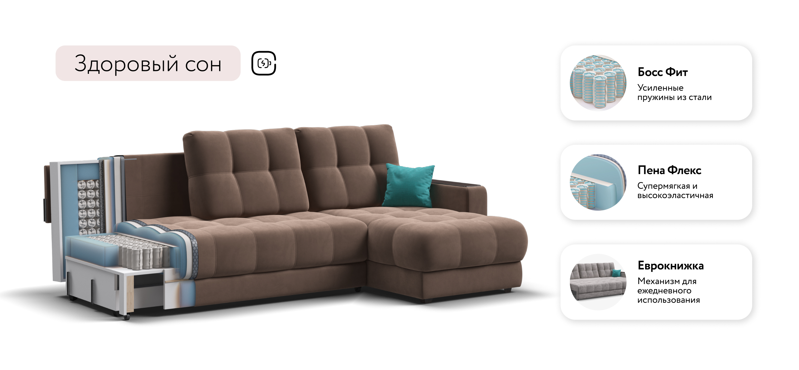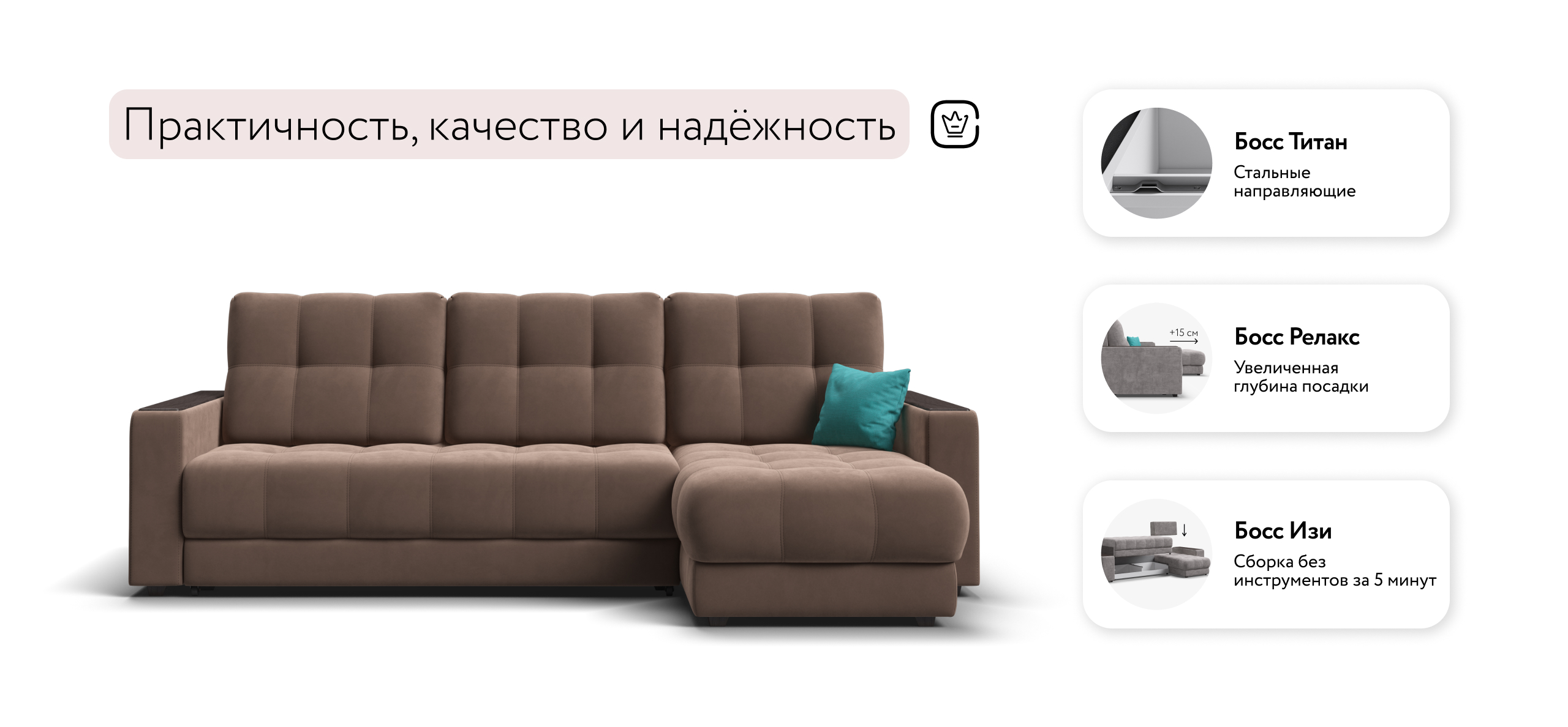 Продуманный до мелочей диван BOSS сочетает в себе мягкие ткани, надежный каркас, качественное наполнение матраса и быструю сборку за 1 минуту без инструментов — ощутите комфорт у себя дома!