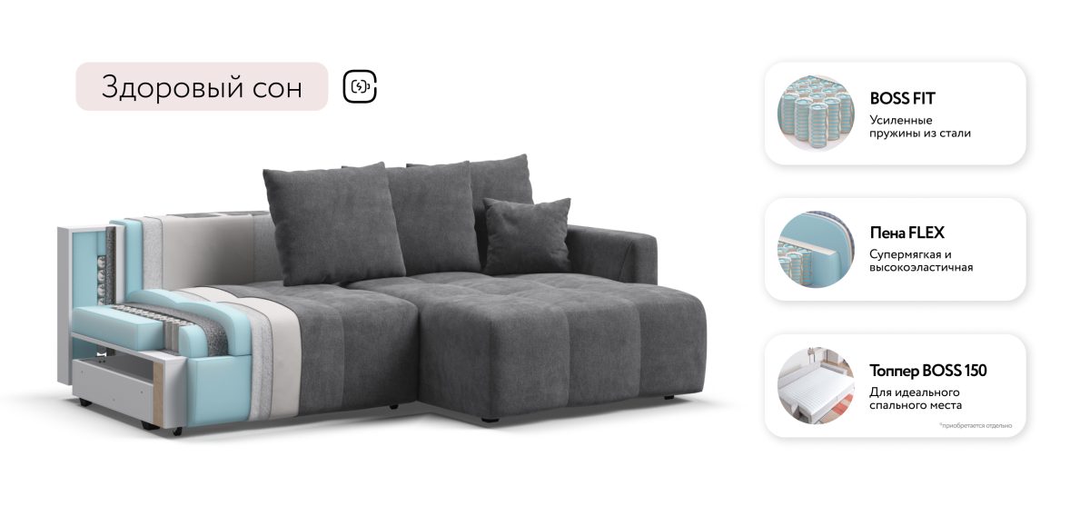 Широкая оттоманка BOSS Loveseat – с комфортом разместит двух человек. Независимый пружинный блок в основании и механизм еврокнижка превращают диван в комфортное спальное место с анатомическим эффектом.