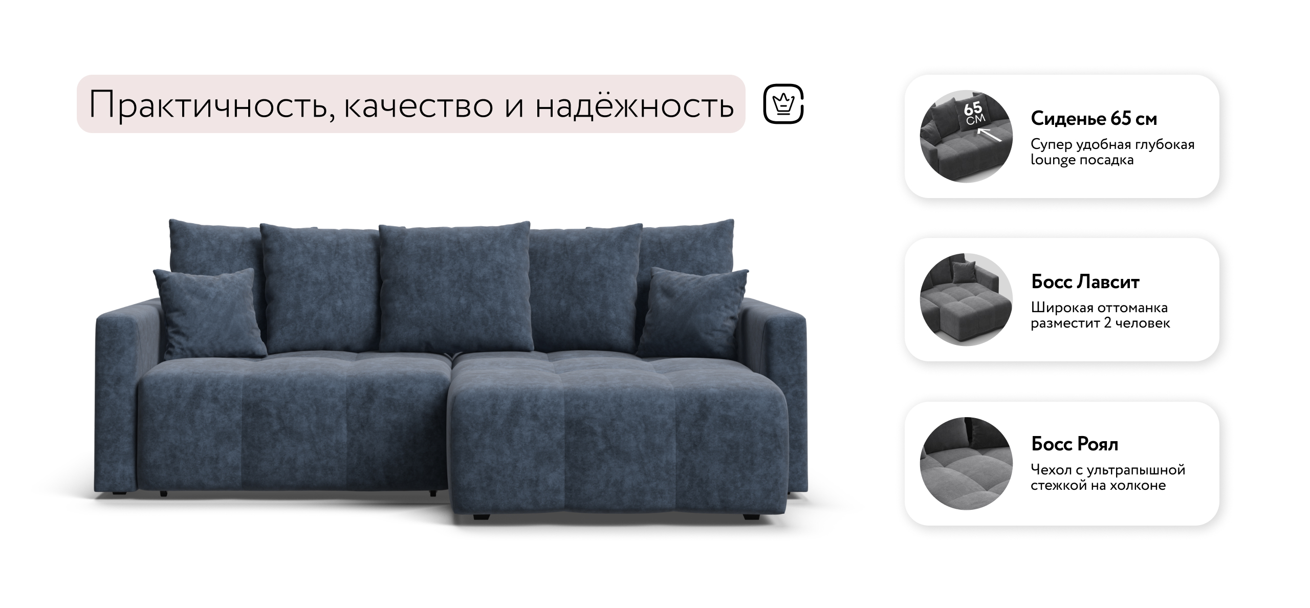 Широкая оттоманка BOSS Loveseat — с комфортом разместит двух человек. Независимый пружинный блок в основании и механизм еврокнижка превращают диван в комфортное спальное место с анатомическим эффектом.