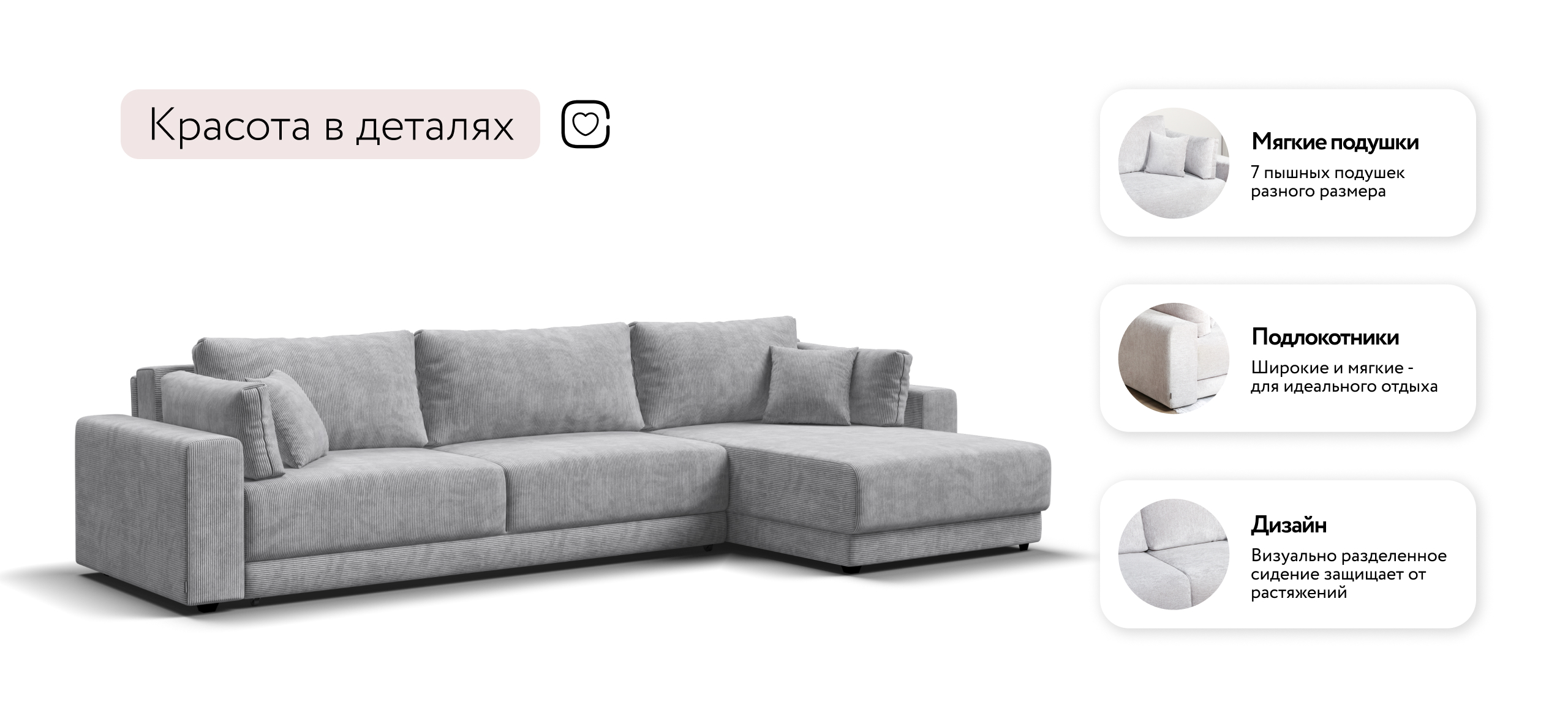 Угловой диван СОтА-77 Макс — это сочетание современного дизайна и продуманной эргономики, создающее уютную атмосферу в любом интерьере. Визуально разделённое сиденье, широкие мягкие подлокотники и пышные подушки разного размера обеспечивают не только эстетическую привлекательность, но и максимальный комфорт.