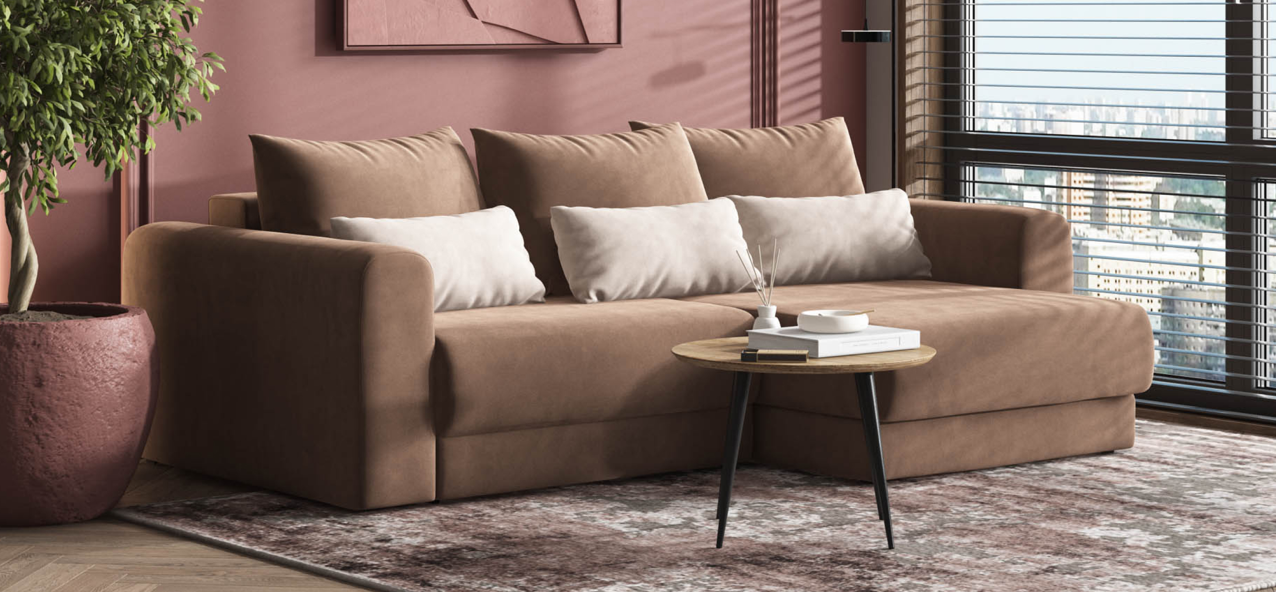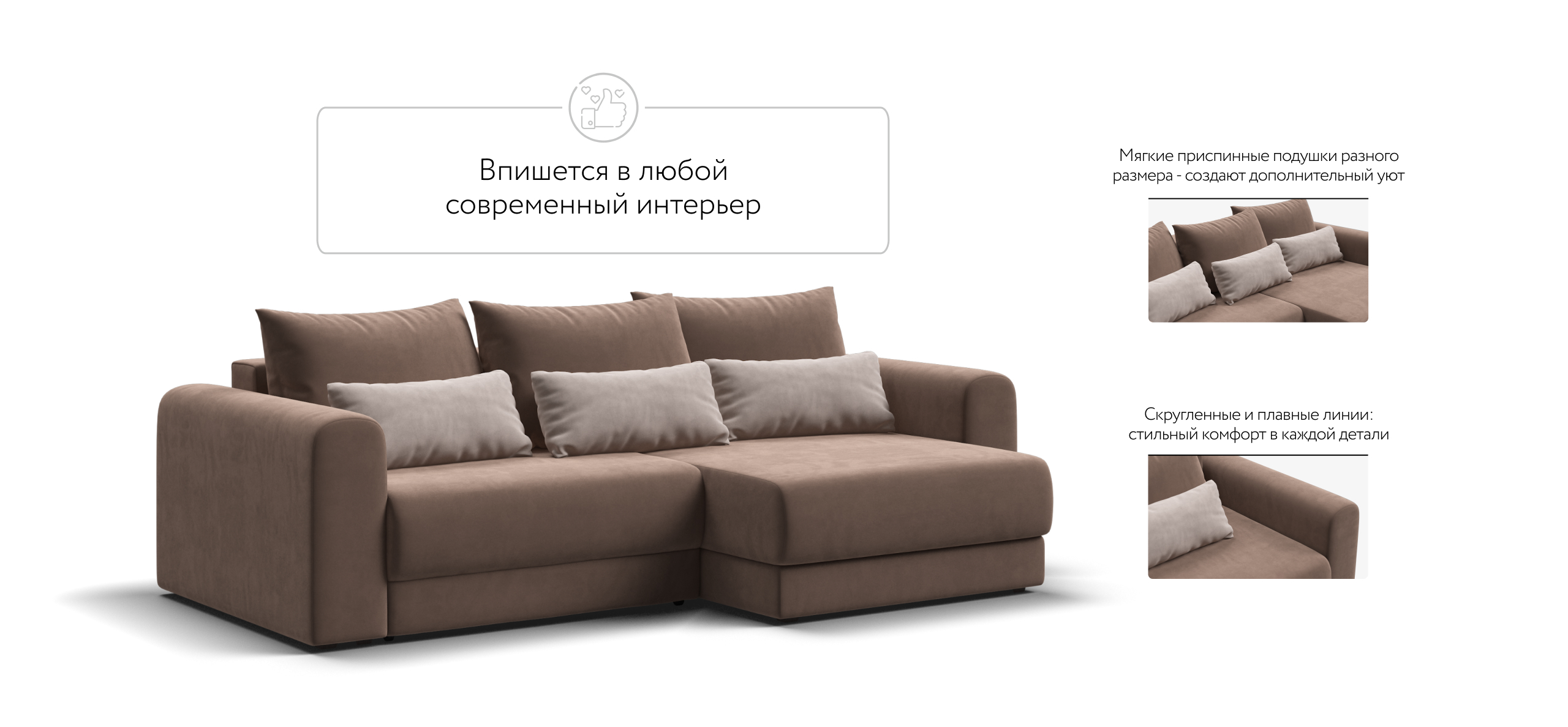 Диван СОтА-33 современный, комфортабельный лаунж диван с оригинальным дизайном. Его плавные формы, комфортная посадка, большое количество декоративных подушек и мягкая ткань добавляют в интерьер уюта. Каждое посадочное место выдвигается вперед и получается универсальный Угловой диван. Благодаря механизму еврокнижка диван с легкостью превращается в полноценное спальное место.